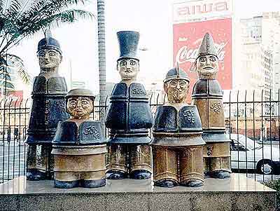 Cinco elementos suspeitos passam o dia olhando para o segurança José Rosalvo dos Santos. Eles dominam a entrada da Pinacoteca do Estado, voltada para a Estação da Luz. São os “Comediantes”, escultura de Francisco Brennand feita em 98 e composta por cinco personagens: a anã, o histrião (do latim histrione, ou seja, caro visitante, um bufão ou palhaço no antigo teatro romano), o bispo, guerreiro e o cavalheiro. "Se for só para olhar, tudo bem, pode. Se não, eu encaro mesmo, fico olhando feio.”