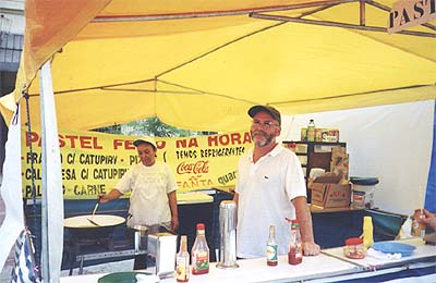 Esse volume total da feira de sábado, segundo ele, é algo entre 700 e 800 pastéis. O preferido dos clientes é o de frango com catupiry, que sai a R$ 1,20. Também tem de camarão, palmito, pizza e os tradicionais queijo e carne. Para rebater, refrigerantes, cerveja e água. (É, "chopps", não rola...) "O pessoal brinca comigo dizendo que eu faço milagre com a perua, porque é muita coisa para trazer."