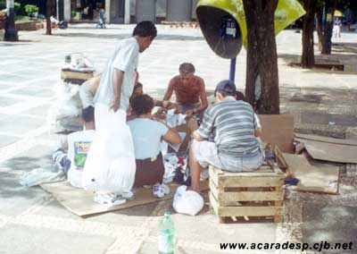 Logo descobrimos que eles vivem ali mesmo na praça, abandonados em meio ao lixo e à criminalidade. O mesmo acontece com os moradores em frente à sede da UIPA (União Internacional de Proteção aos Animais). Na extrema miséria, eles dependem da boa vontade de quem vive na região e doa alimentos. A pinga é um elemento inseparável "pra passar o dia" de quem jura que nunca cometeu um crime na vida.