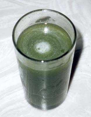 O suco é feito só com ingredientes naturais. Mas a aparência não é das mais bonitas: parece uma batida de couve! Não faz mal, o Sampacentro atesta. Nem tão pouco é das coisas mais gostosas que já bebi - cá entre nós, prefiro um chope no Brahma.