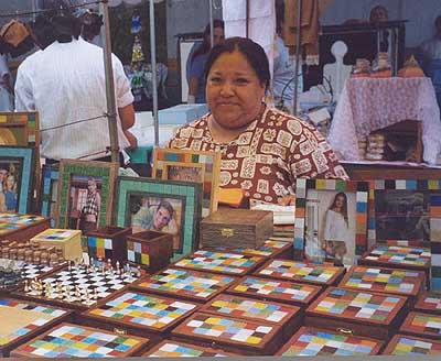 Caixas, porta-chaves, porta-retratos, tabuleiros de xadrez e dama, tudo em madeira. Estas e outras peças são vendidas pela boliviana Joana na feira de artesanatos que acontece todos os domingos em um estacionamento na frente da Praça da República. O colorido das peças chama atenção de quem passa, pois a maioria tem aplicações de pastilhas de diversos tons, o que dá um toque alegre e diferente aos produtos.