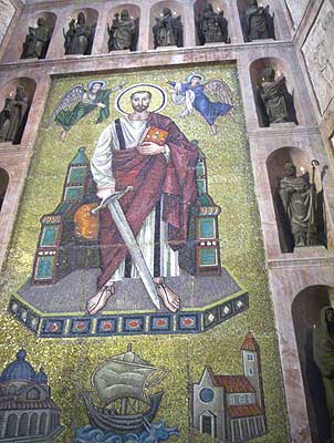 O passeio com Vera também revela os dois padroeiros da igreja: Nossa Senhora da Assunção, homenageada em altares e mosaicos por toda a nave central, e São Paulo, com a espada que simboliza seu dom da palavra e representações de suas viagens do Ocidente ao Oriente para pregar a palavra de Deus.
